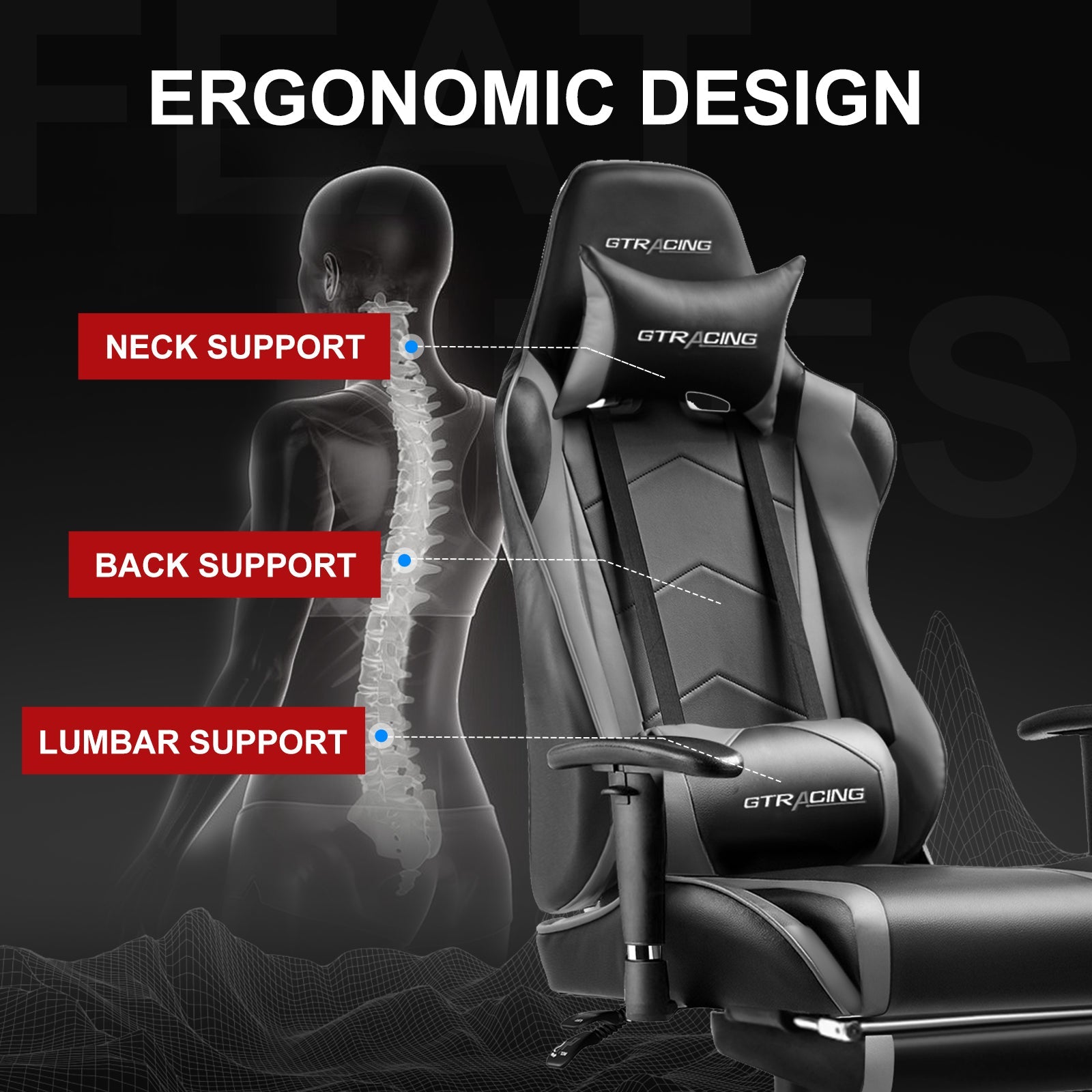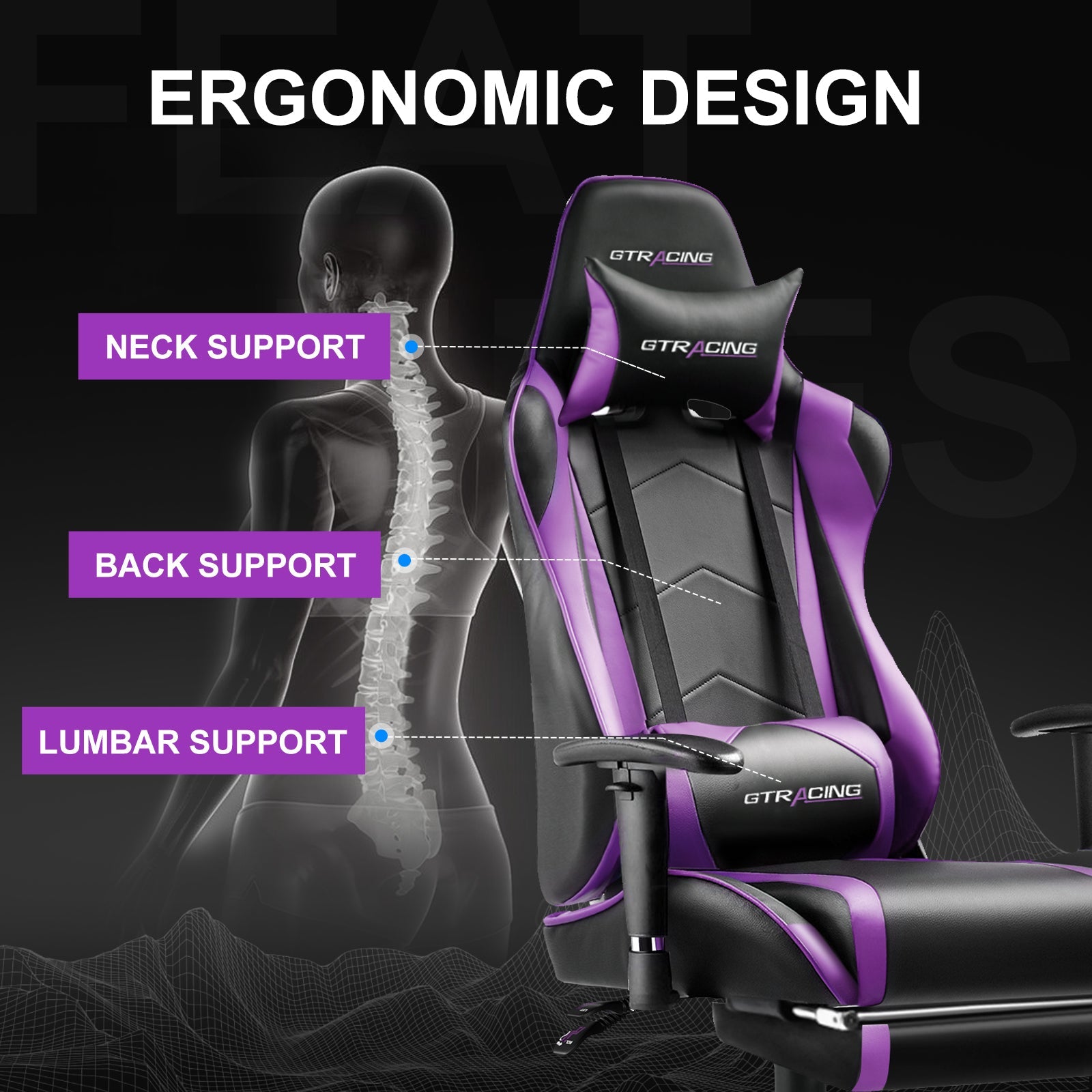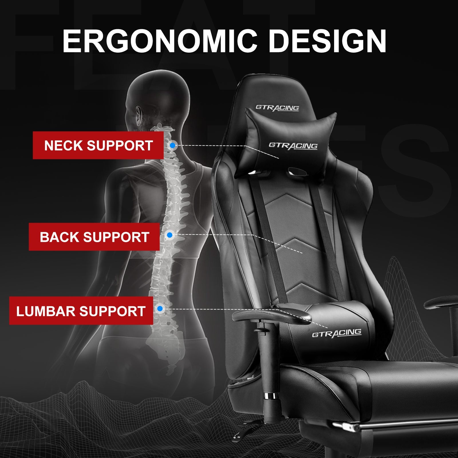 GTRACING gaming chair is your ideal choice for working, studying, and gaming. The GTRACING 099 Footrest series with ergonomic design is one of the classical series among our products. With a footresr ,adjustable headrest and lumbar pillow, it comforts both the cervical and lumbar spine. The racing-style angle adjustor helps you enjoy reclining and rocking at the same time. Seat cushion and chair back full of high-density sponge keep you comfortable after day-long sitting. The ergonomic design and high-quality material make GTRACING chairs perfect for both home and modern offices.