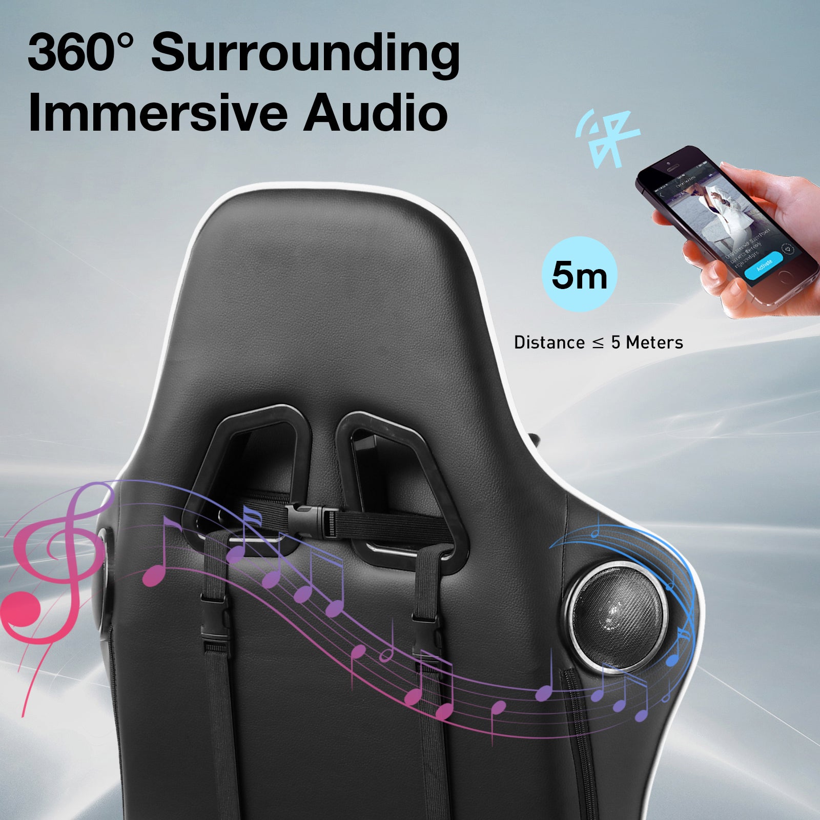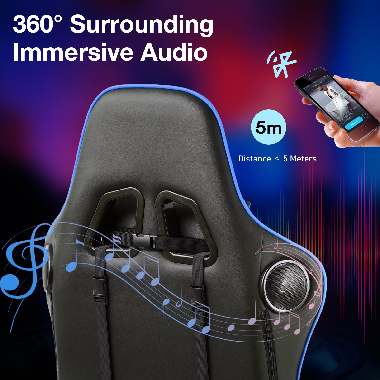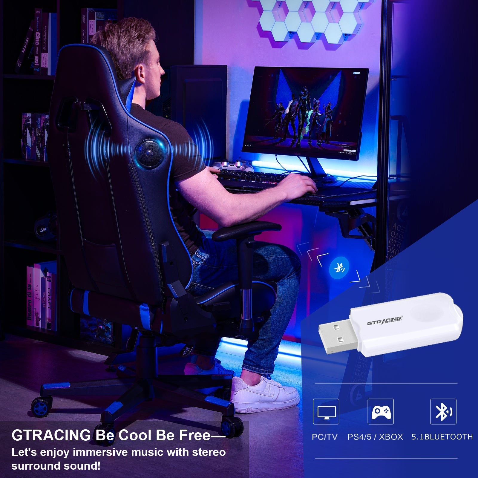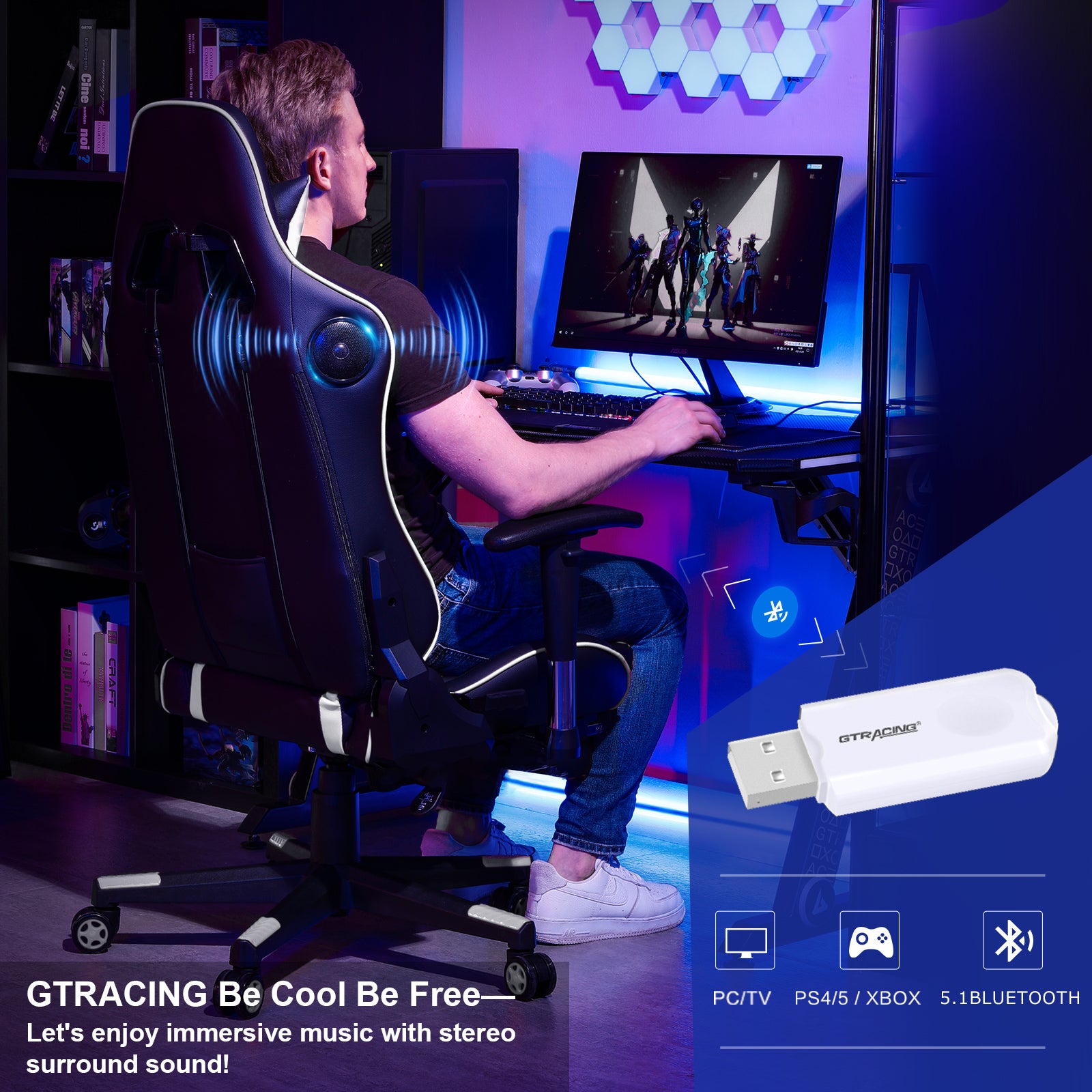 - Enjoy Music: The chair is equipped with two Bluetooth speakers, which can be connected to your phone, tablet. It can also be connected to PS4/PS5/XBOX/SWITCH with a dedicated usb bluetooth transmitter(sold separately) within 5 meters, it will bring you remarkable and richly detailed stereo sound in solid bass, clear and full audio. You can enjoy music for 6 hours when fully charged.