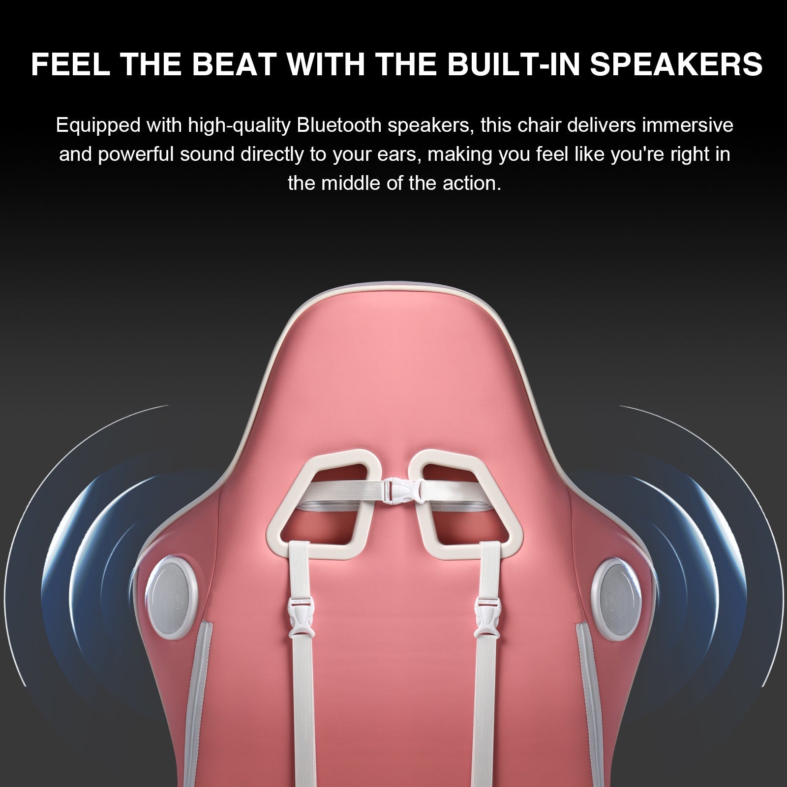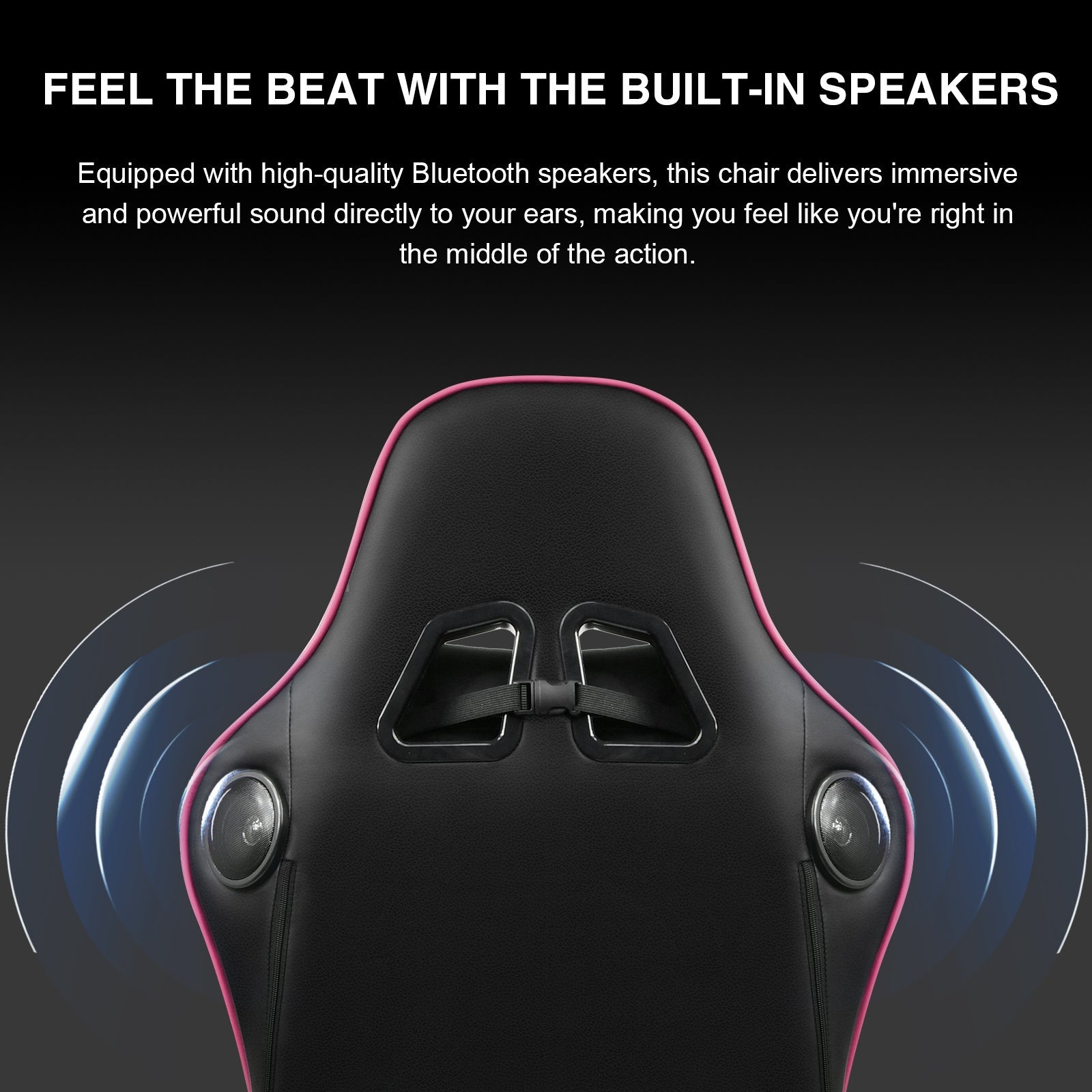 The chair is equipped with two Bluetooth speakers, which can be connected to your smart phone, tablet or other Bluetooth enabled devices by a Bluetooth Adapter(not included) within 5 meters, it will bring you remarkable and richly detailed stereo sound in solid bass, clear and full audio. You can enjoy music for 6 hours when fully charged.